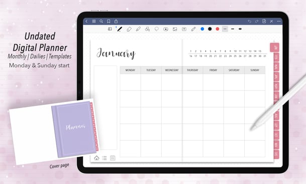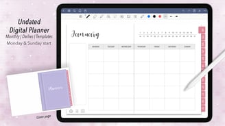 This freebie set is an Undated Digital Planner. It has monthly, dailies and other templates. This download includes Sunday and Monday starts.