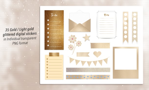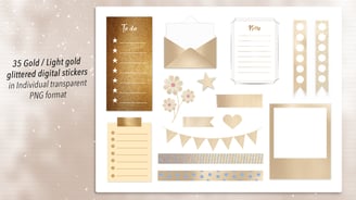 35 Gold / Light Gold Glittered Functional Digital Stickers in PNG format